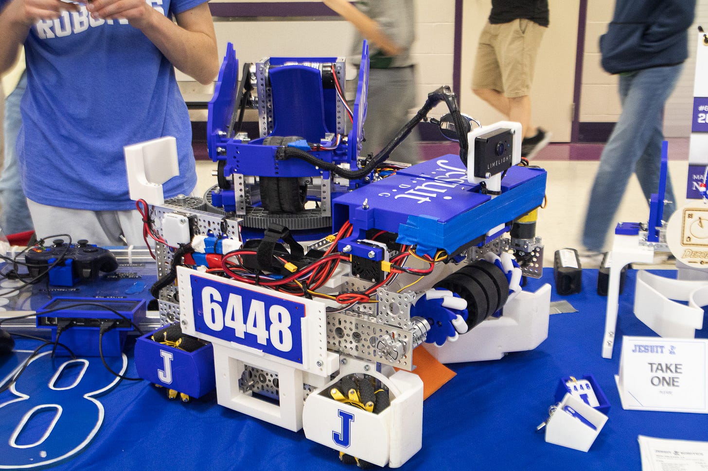 The pattern is randomized at the start of each round. The game also includes a lot of contact relative to prior games. All these factors create a unique game, but since there is only one way to score teamwork is not as necessary. To talk about the bot, it is 18in x 18in roughly 30lbs bot. The bot has an automatic sorter, called a spindexer, a self-aiming turret, as well as a 12in intake for the artifacts. Also, our team number is 6448. This is the same number every year and Jesuit’s is the lowest number because we are the oldest team in the state starting in 2012.